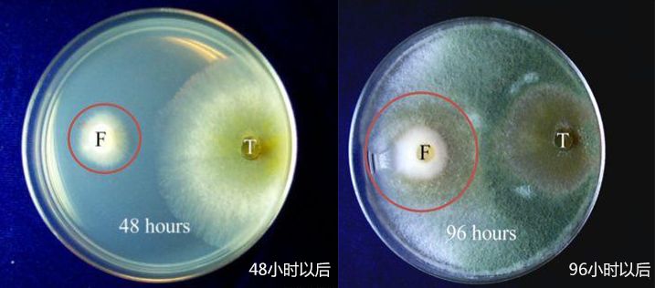 培養96小時:哈茨木霉菌的菌落要遠遠大于鐮刀菌的菌落。